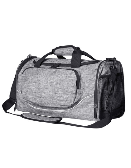 Gråmelerad mångsidig sportväska i polyester i 600D polyester. Huvudfack med en lång U-formad tvåvägsdragkedja med liten öppen innerficka. Påsydd ficka på framsidan med dragkedja. Två sidofickor med dragkedja varav en är för kläder eller skor och med ytterligare ett påsytt fack i svart luftnät med elastiskt band. Avtagbar och justerbar axelrem med flexibel axelvaddering. Två bärremmar med vadderade kardborrehandtag. Ytterligare ett handtag på sidan. Förstärkt botten med fyra tassar. Två smala reflexband längs med sidorna. Alla dragkedjor är svarta och har dragtappar i gummi med präglad ”bags2GO”-logotyp. Kapacitet: ca 31 liter